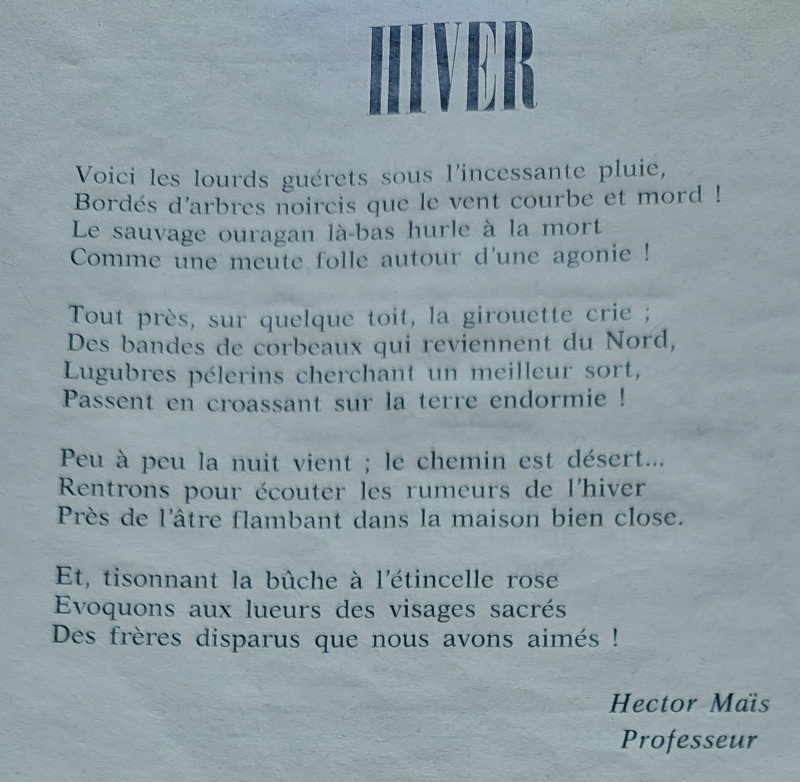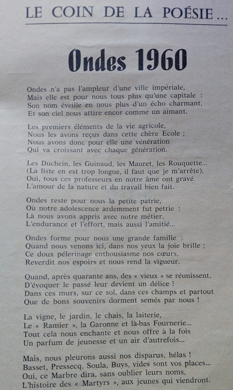 Voici deux poêmes retrouvés sur l'ANNUAIRE 1961-1962 des ANCIENS ELEVES de L'ECOLE REGIONALE d'AGRICULTURE d'ONDES en page 37 et 38 titré "LE COIN DE LA POESIE"