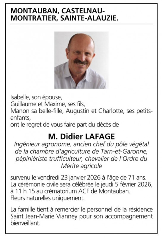 Didier LAFAGE s’est éteint le 23 janvier dernier, à l’âge de 71 ans. Avec lui disparaît une figure discrète mais essentielle du monde agricole, un homme qui aura consacré sa vie aux agriculteurs. Si son engagement professionnel s’est principalement déployé en Tarn et garonne, ses racines étaient profondément lotoises à Castelnau-Montratier-Ste-Alauzie en Quercy Blanc.